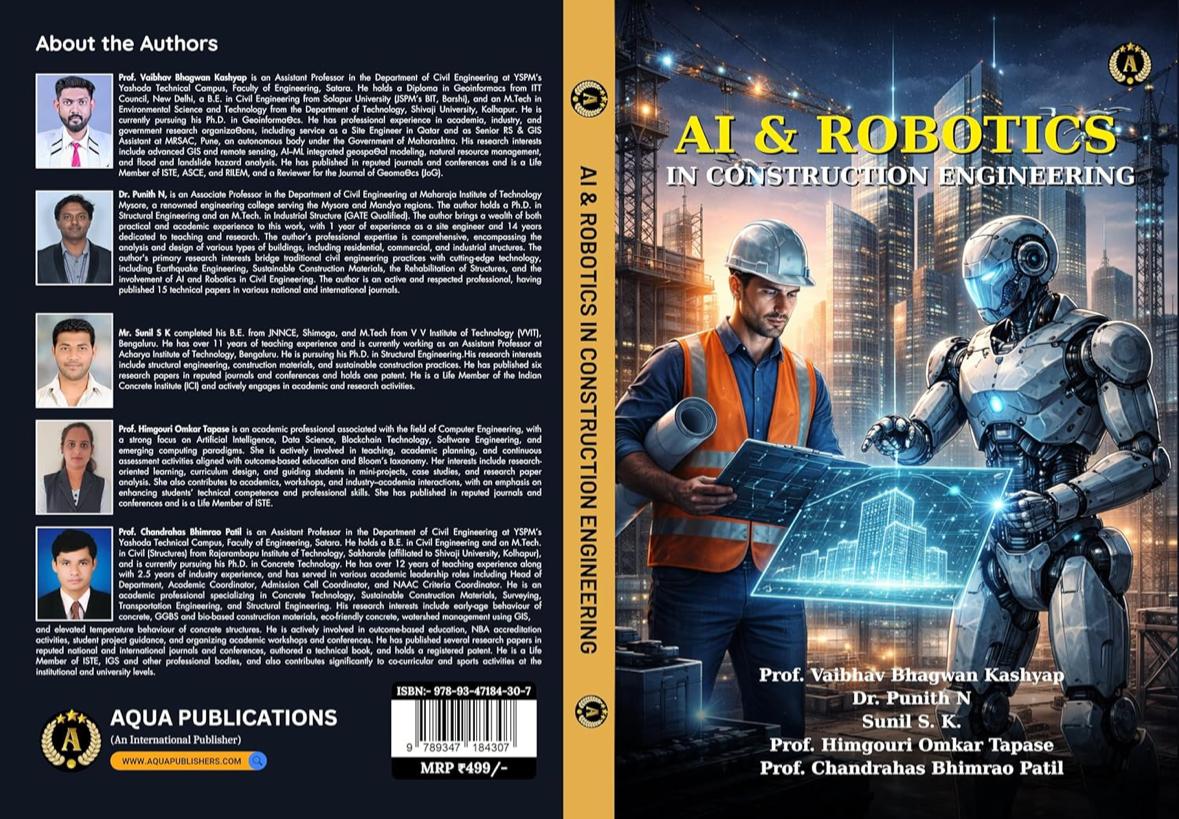 Mr. Vaibhav B Kashyap and Mr. Chandrahas B Patil, Assistant professor in Civil Engineering, Yashoda Technical Campus, Satara has published book titled "AI & Robotics in Construction Engineering" in AQUA Publication (International Publisher ISBN: 978-93-47184-30-7).