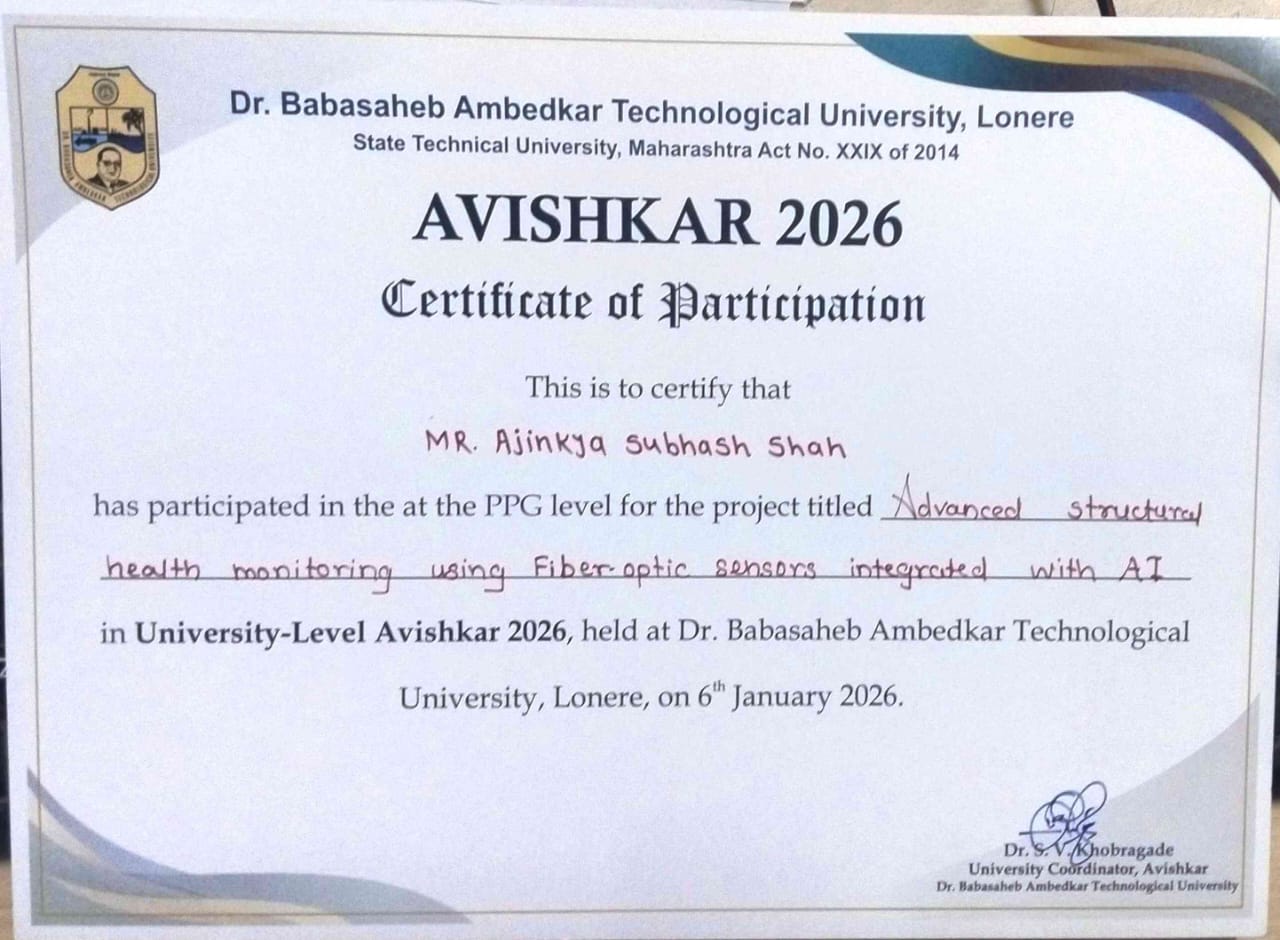 Mr. Ajinkya S Shah, Assistant professor in Civil Engineering has participated in University-Level Avishkar 2026 held at Dr. Babasaheb Ambedkar Technological University, Lonere on 6th januart 2026.