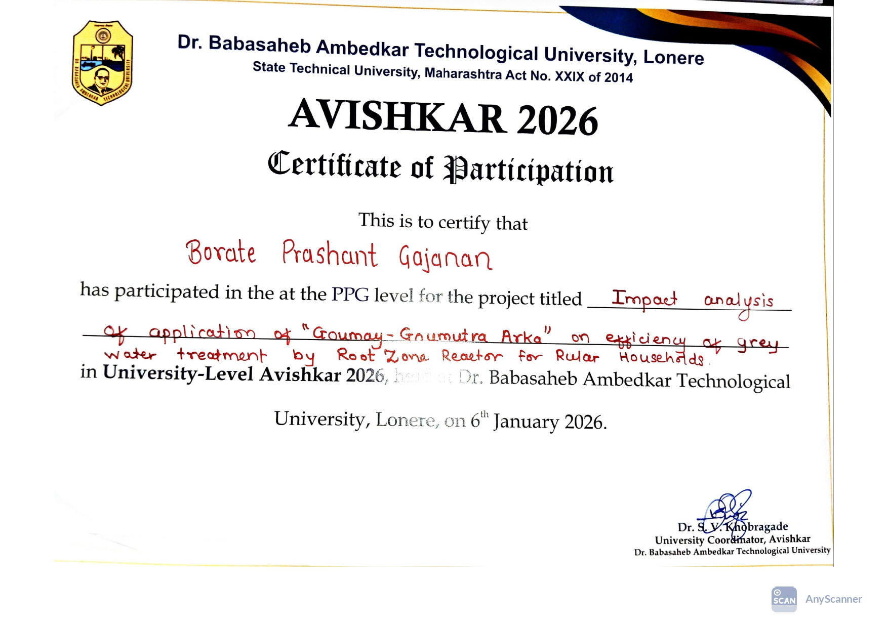 Mr. Prashant G Borate, Assistant professor in Civil Engineering has participated in University-Level Avishkar 2026 held at Dr. Babasaheb Ambedkar Technological University, Lonere on 6th januart 2026.
