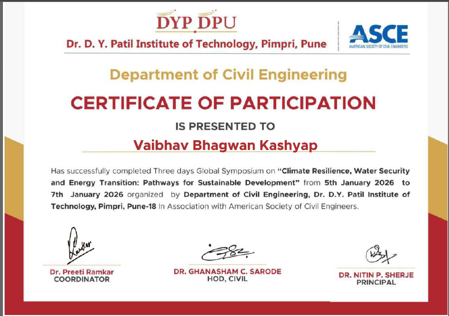 Mr. Vaibhav B Kashyap, Assistant professor in Civil Engineering has attended and successfully completed Three days global Symposium on “Climate, Resilience, Water Security and Energy Transition: Pathways for Sustainable Development” organized by Department of Civil Engineering, Dr. D. Y. Patil Institute of Technology, Pimpri from 5th – 7th January, 2026.