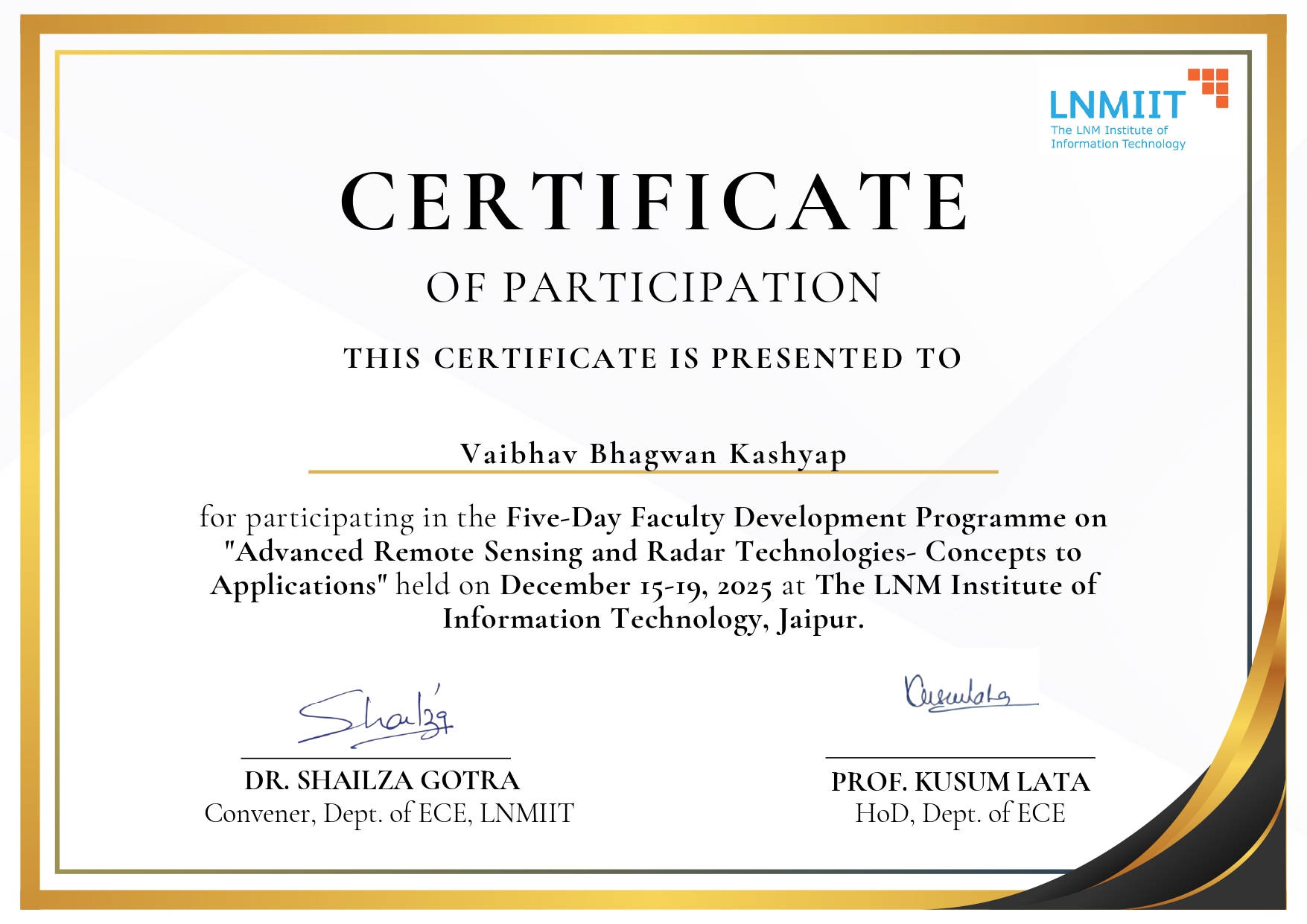 Mr. Vaibhav B Kashyap, Assistant professor, Assistant professor in Civil Engineering has attended and successfully completed five day FDP on “Advance Remote Sensing and Radar Technologies-Concepts to Applications” organized by LNM Institute of Information Technology, Jaipur from 15/1/2026 to 19/1/2026.