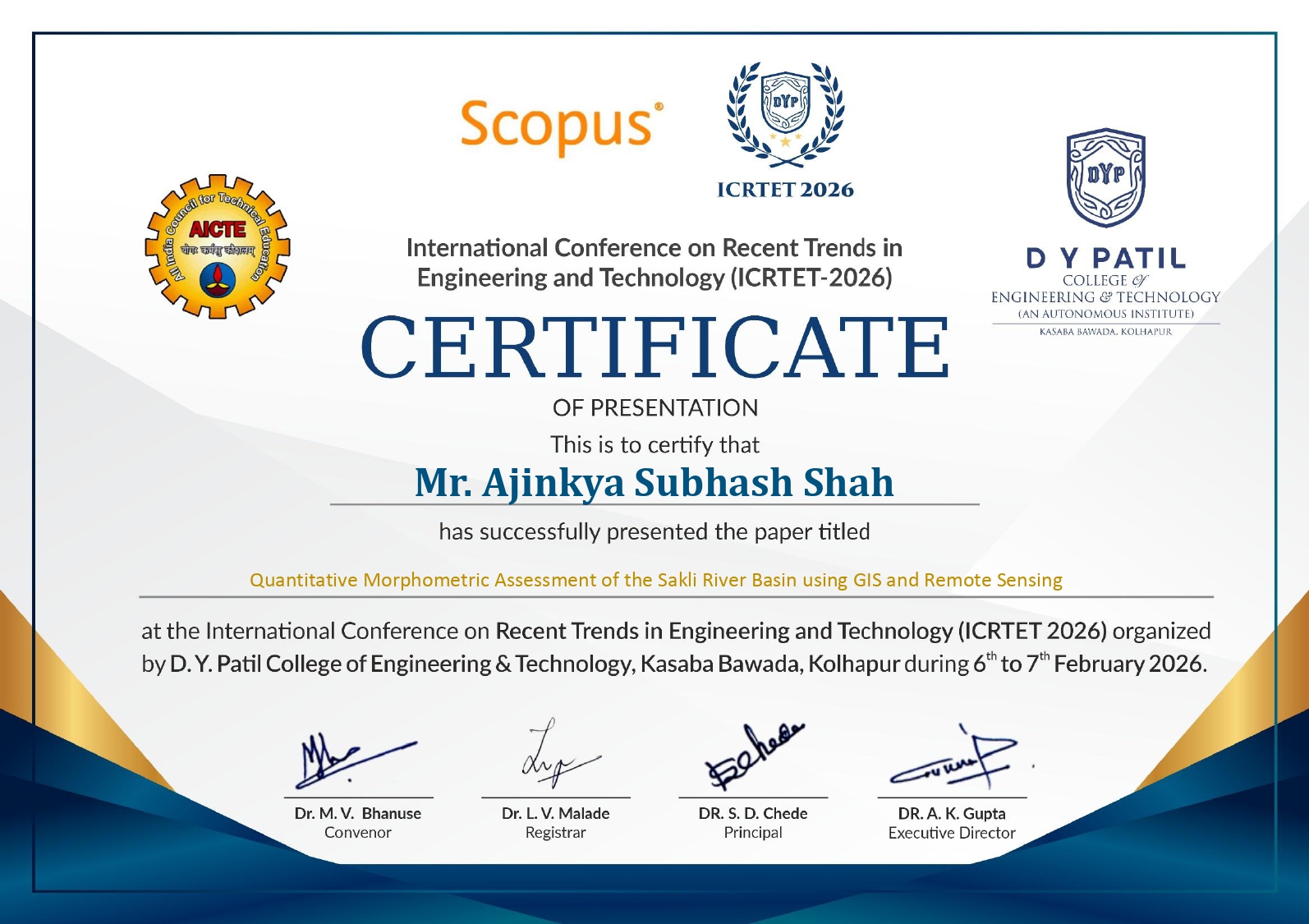 Mr. Ajinkya Subhash Shah, Assistant Professor in Department of Civil Engineering, YSPM's Yashoda Technical Campus, Satara has presented research paper on "Quantitative Morphometric Assessment of the Sakli River Basin using GIS and Remote Sensing" in International Conference on Recent Trends in Engineering and Technology (ICRTET 2026) held at D Y Patil College of Engineering and Technology, Kasaba Bawada, Kolhapur, during 6th February to 7th February 2026.
