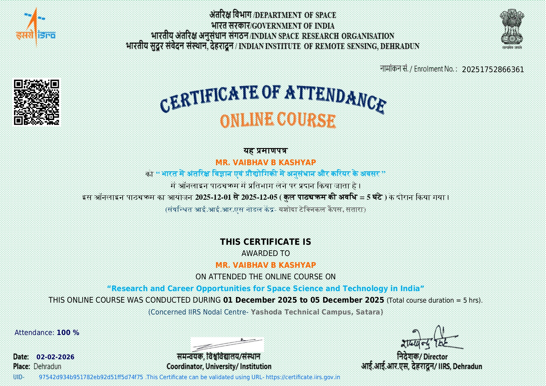 Mr. Vaibhav B Kashyap, Assistant professor in Civil Engineering has attended and successfully completed online course on “Research and Career opportunities for Space Science and Technology in India” organized by IIRS on 02/02/2026.