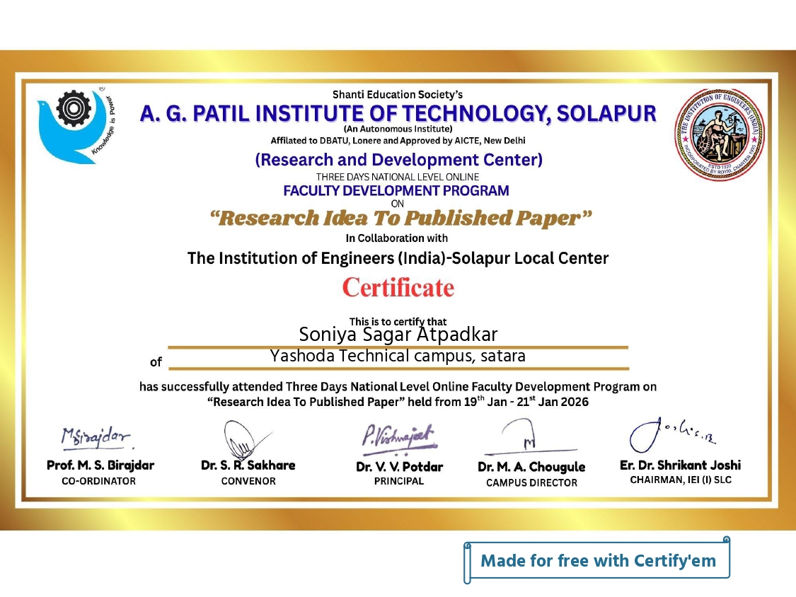 Mrs.SONIYA SAGAR ATPADKAR has successfully completed the ISTE approved Self-Financing Faculty Development Program on “Bridging AI and Robotics: Future of Intelligent Machines” held during 15.07.2025 to 19.07.2025 organized by Yashoda Technical Campus, Satara, Maharashtra.