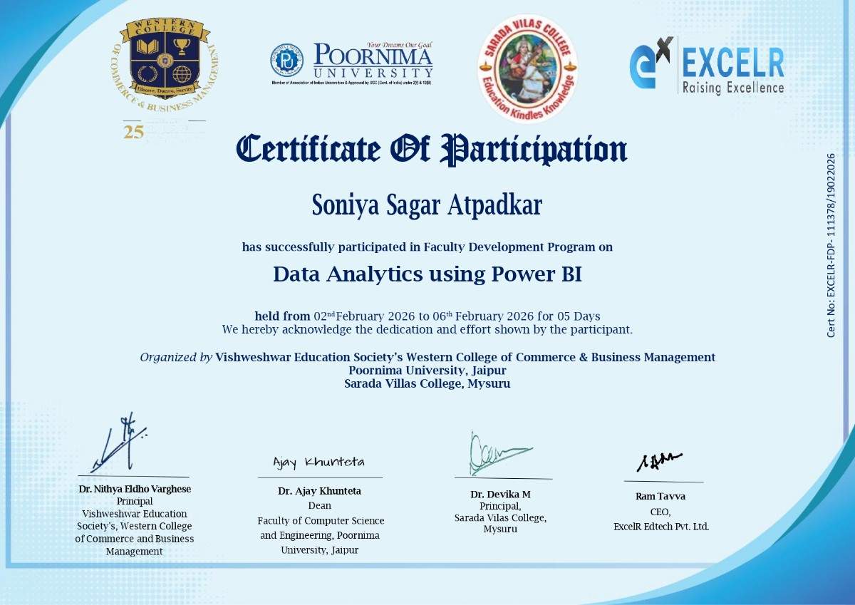 Mrs. Soniya Sagar Atpadkar has successfully participated in Faculty Development Program on "Data Analytics using Power BI" held from 02nd February 2026 to 06th February 2026 for 05 Days.