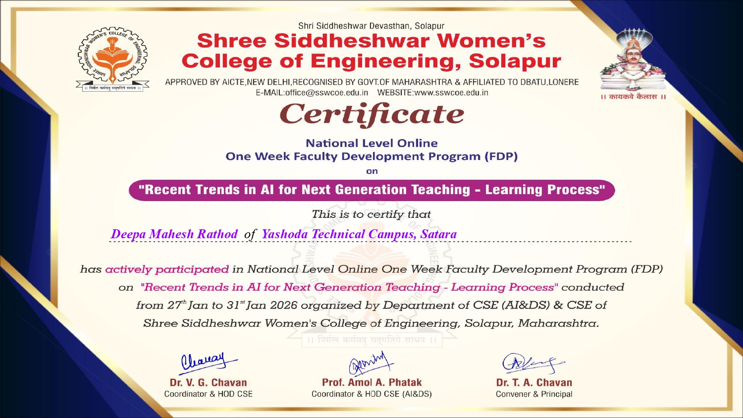 Mrs. Ashwini Atit Kadam of Yashoda Technical Campus, Satara. has participated in a 40 hours Online Faculty Development Program on “Smart Integration: Advancing IoT, AI/ML, Photonics, 5G, and Nanodevices”