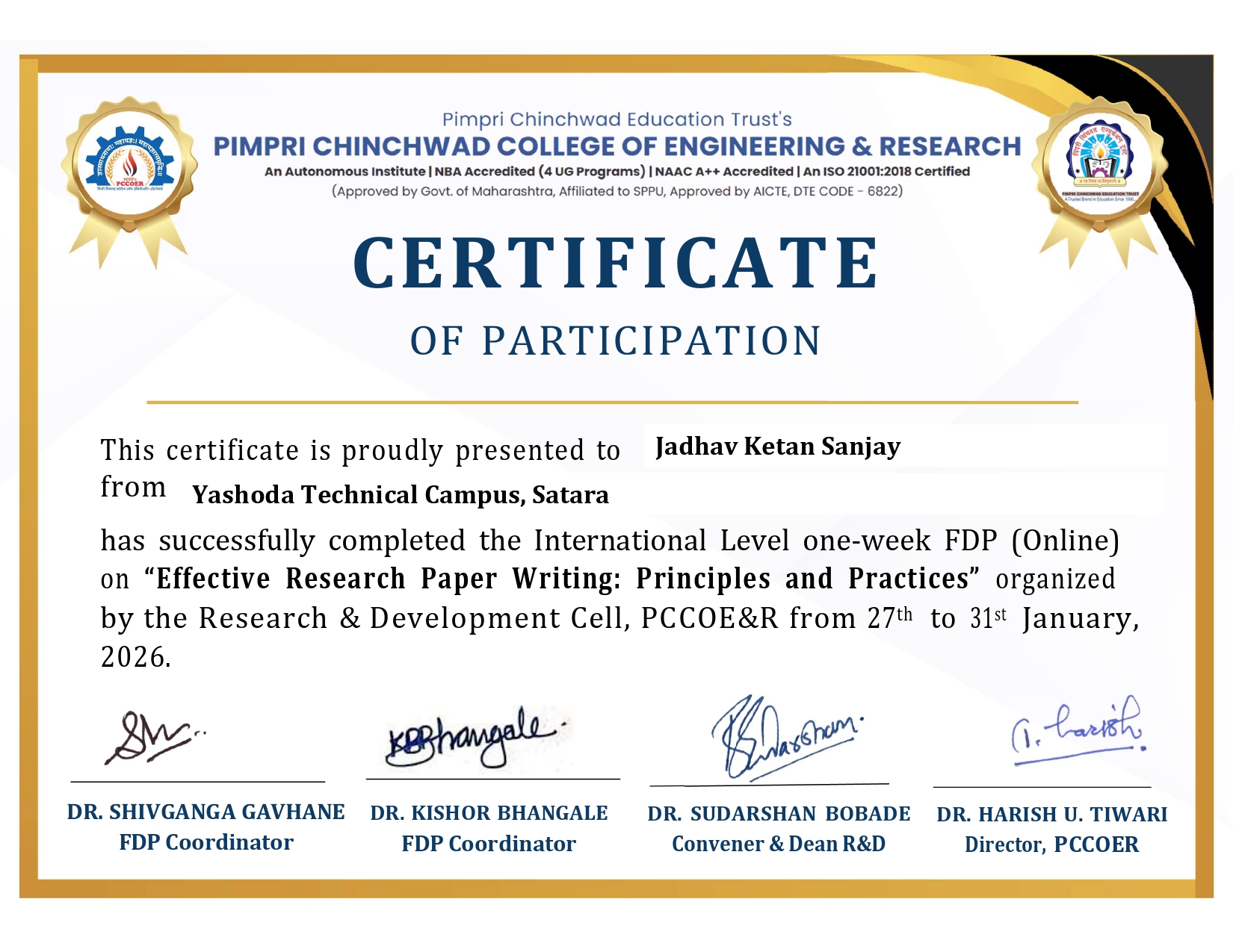 MR.KETAN SANJAY JADHAV has successfully participated in the International Level one-week FDP (Online) on “Effective Research Paper Writing: Principles and Practices” organized by the Research & Development Cell, PCCOE & R from 27th 2026. to 31st January 2026.