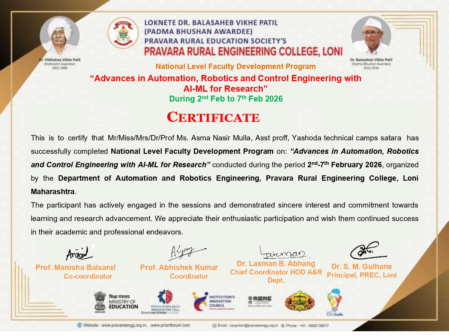 Ms.Asma Mulla has successfully completed National Level Faculty Development Program on: “Advances in Automation, Robotics and Control Engineering with AI-ML for Research” conducted during the period 2nd-7th February 2026,